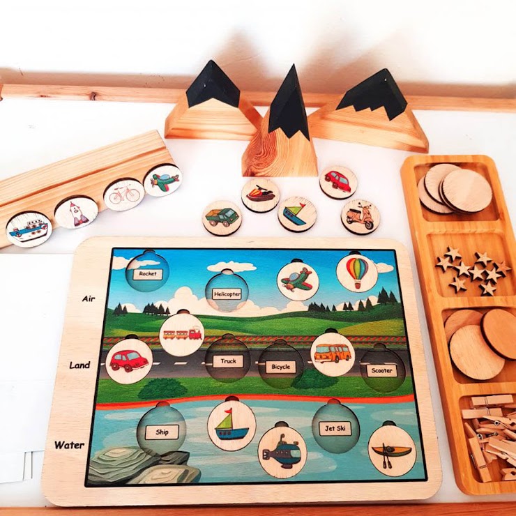 The aim of this artistic sorting board is to apply analytical skills and practice clustering various means of transportation that travel by land, air or sea. During play, encourage your child to explain similarities and differences, while establishing cause-effect relationships.