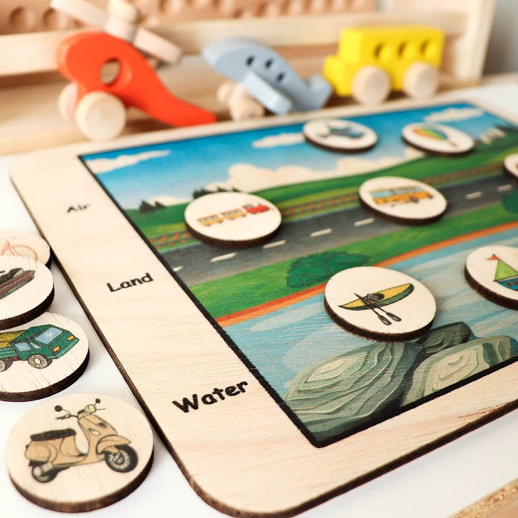 The aim of this artistic sorting board is to apply analytical skills and practice clustering various means of transportation that travel by land, air or sea. During play, encourage your child to explain similarities and differences, while establishing cause-effect relationships.